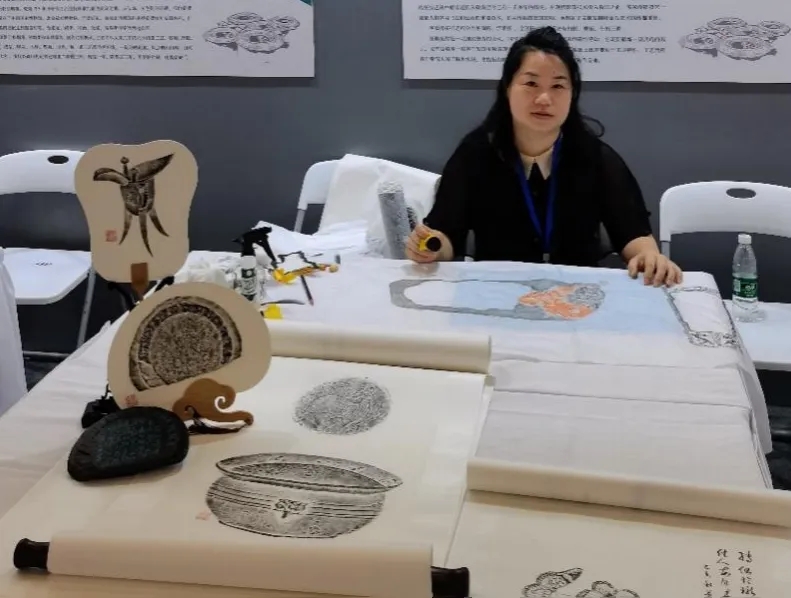 叶愉,非遗传承人,客家传拓技艺第五代传承人,毕业于贵州大学,国画专业硕士研究生,研究整理客家传拓技艺,擅长书法篆刻等技艺。叶老师的全形拓作品,造型严谨,墨色层次丰富。同时,还将客家传拓技艺运用到艺术实践当中,在拓片上补绘、题跋,把艺术拓片与中国传统诗书画印相结合,使拓片艺术性更加丰富。