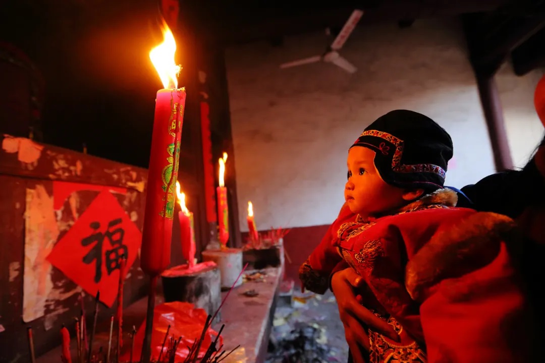 客家人带着出生不久的小孩,去宗族祠堂祭祀求福平安  (2018)