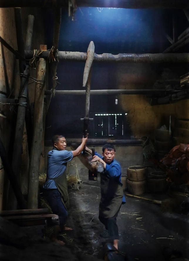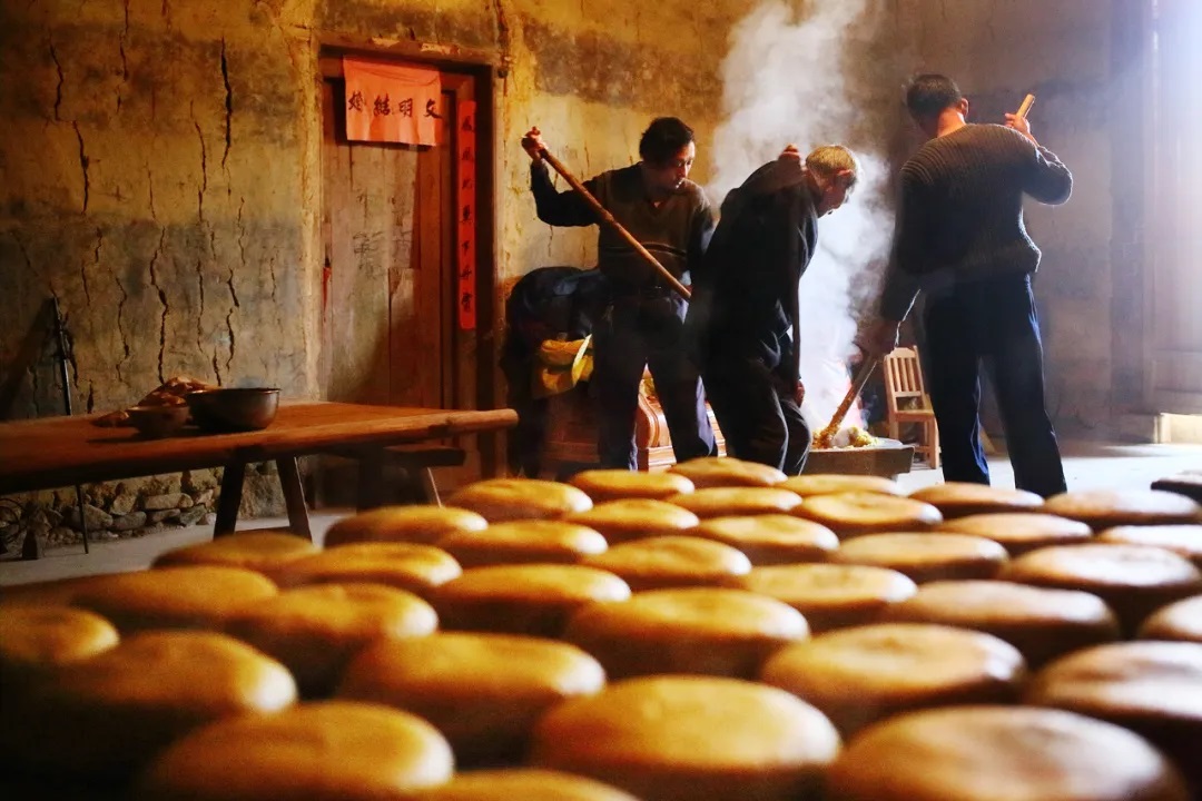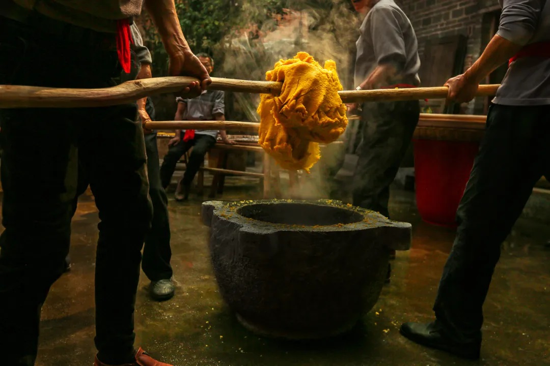 丰收之后,族人围在一起,在石臼里碾打黄元米粿  (2014)