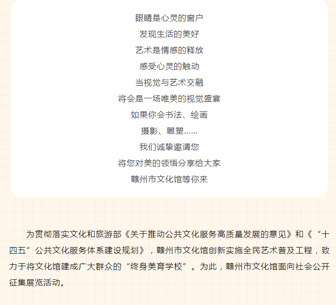 ※ 特别声明:本公众号仅用于赣州市文化馆公共文化服务及群众文化艺术普及,不用于任何商业用途。所转载文章及图片、视频、音频等版权均属原作者。如有侵权,请及时与本公众号联系。
