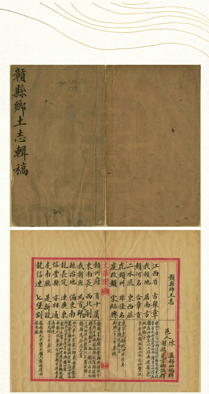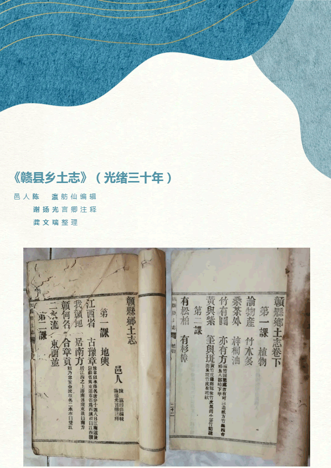 该《赣县乡土志》为谢扬光(言卿)注释,光绪三十年(1904年)成书。通篇为三字文体,人文地理,物产花卉,山水寺庙,集于一书,内容详实,押韵顺口。