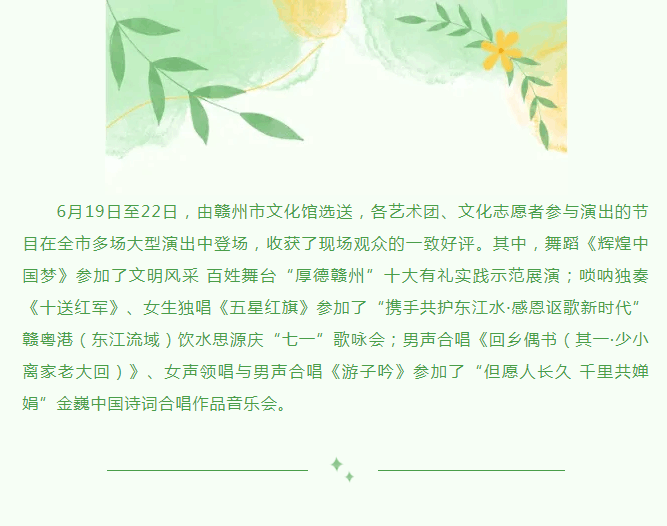 ※ 特别声明:本公众号仅用于赣州市文化馆公共文化服务及群众文化艺术普及,不用于任何商业用途。所转载文章及图片、视频、音频等版权均属原作者。如有侵权,请及时与本公众号联系。