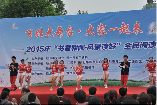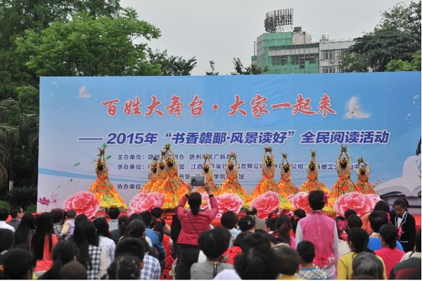 2015年4月18日,由赣州市文明办、赣州市文广新局主办,赣州市群众艺术馆等承办的“百姓大舞台-大家一起 来”2015年“书香赣鄱 风景独好”全民阅读活动文艺演出在中心城区南门文化广场西园举行,此次活动共有11个节目参加了演出,精彩的文艺表演吸引了近1000名市民观看。通过活动,进一步激发了市民阅读的热情和兴趣,倡导多读书,提高广大市民的文化素质,提升城市文化品位和城市文明程度。