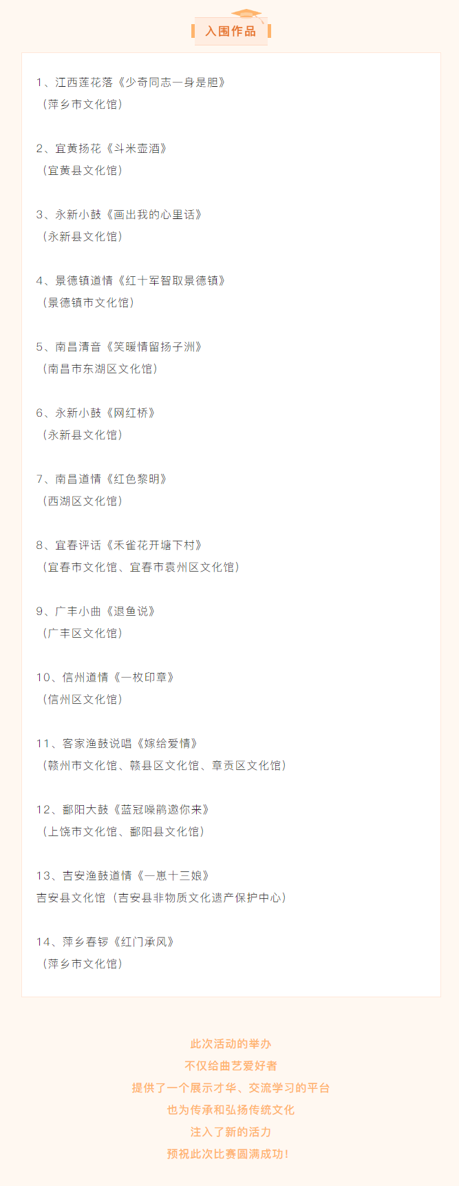 ※ 特别声明:本公众号仅用于赣州市文化馆公共文化服务及群众文化艺术普及,不用于任何商业用途。所转载文章及图片、视频、音频等版权均属原作者。如有侵权,请及时与本公众号联系。