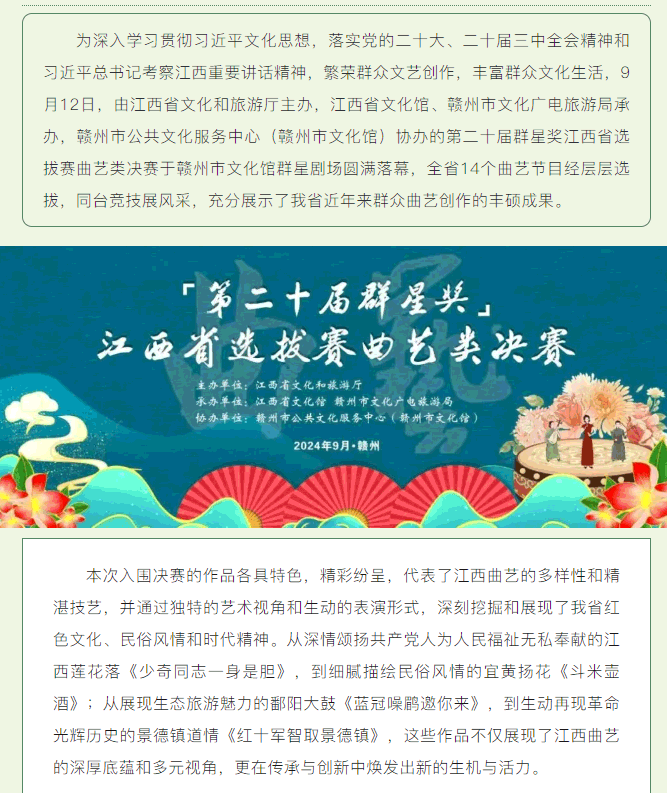 ※ 特别声明:本公众号仅用于赣州市文化馆公共文化服务及群众文化艺术普及,不用于任何商业用途。所转载文章及图片、视频、音频等版权均属原作者。如有侵权,请及时与本公众号联系。