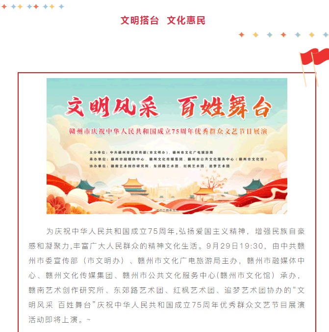 ※ 特别声明:本公众号仅用于赣州市文化馆公共文化服务及群众文化艺术普及,不用于任何商业用途。所转载文章及图片、视频、音频等版权均属原作者。如有侵权,请及时与本公众号联系。