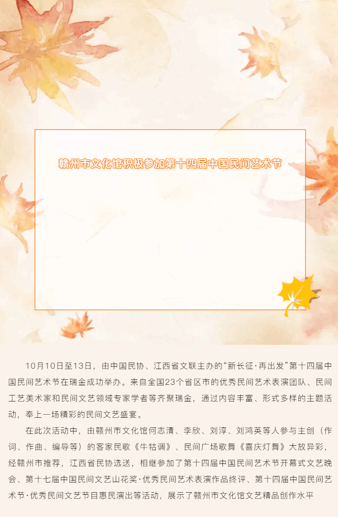 ※ 特别声明:本公众号仅用于赣州市文化馆公共文化服务及群众文化艺术普及,不用于任何商业用途。所转载文章及图片、视频、音频等版权均属原作者。如有侵权,请及时与本公众号联系。