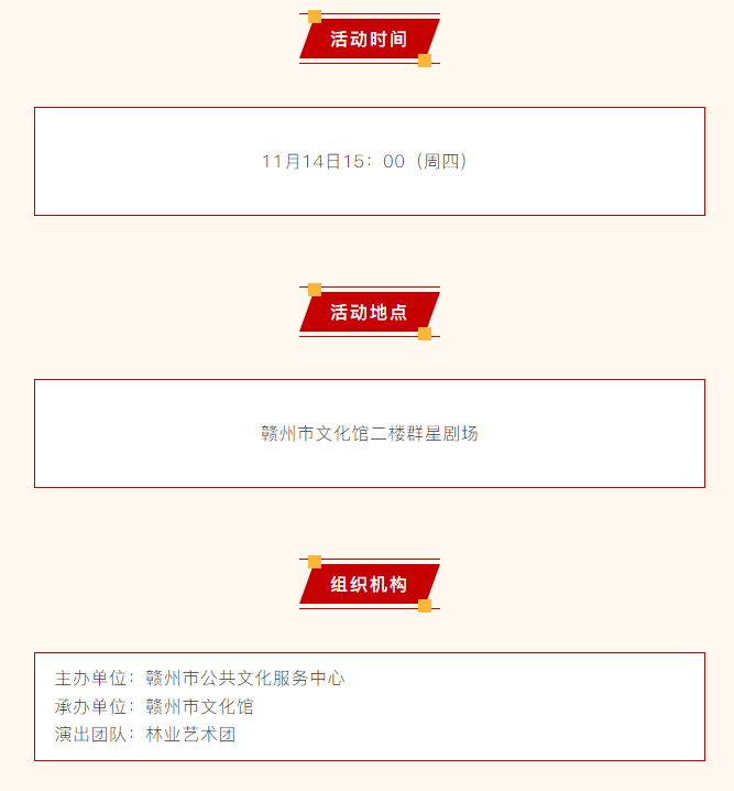 ※ 特别声明:本公众号仅用于赣州市文化馆公共文化服务及群众文化艺术普及,不用于任何商业用途。所转载文章及图片、视频、音频等版权均属原作者。如有侵权,请及时与本公众号联系。