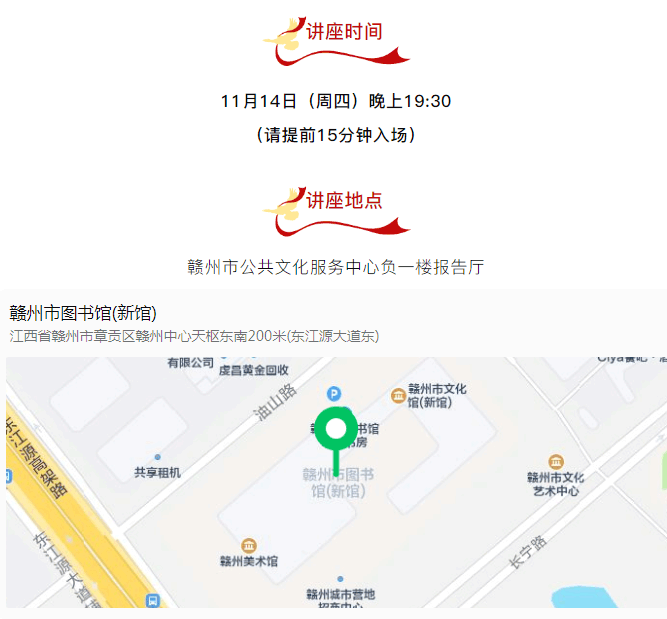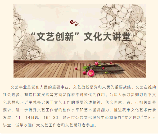 ※ 特别声明:本活动信息仅用于赣州市音乐家协会、赣州市文化馆公共文化服务及群众文化艺术普及,不用于任何商业用途。所转载文章及图片、视频、音频等版权均属原作者。如有侵权,请及时与本公众号联系。
