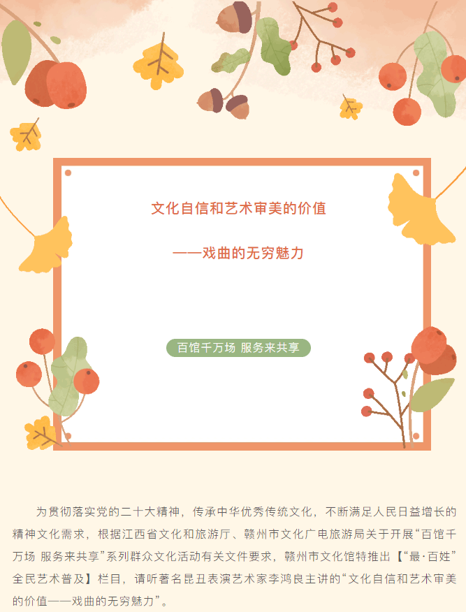 ※ 特别声明:本公众号仅用于赣州市文化馆公共文化服务及群众文化艺术普及,不用于任何商业用途。所转载文章及图片、视频、音频等版权均属原作者。如有侵权,请及时与本公众号联系。