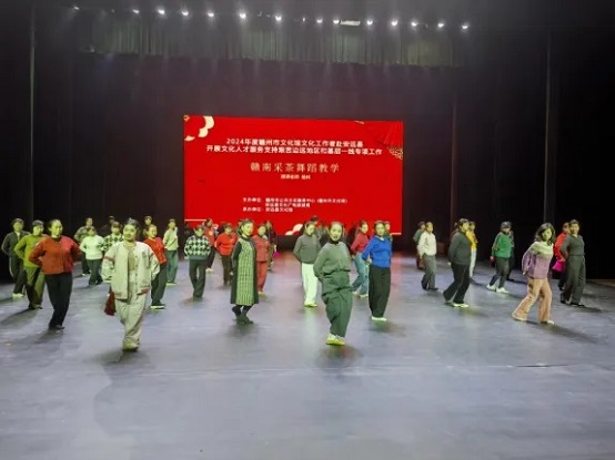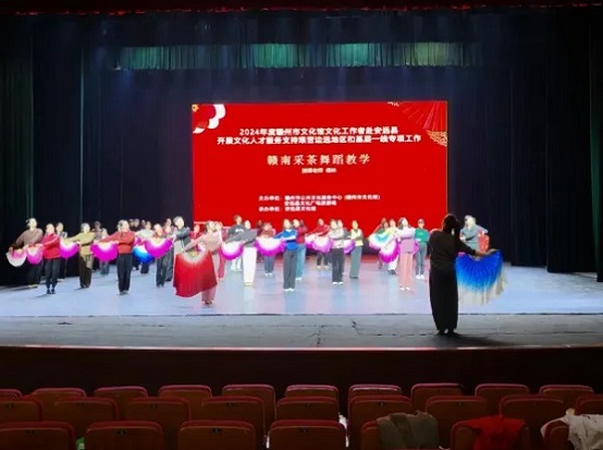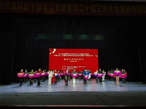 2024年12月6日,由赣州市公共文化服务中心(赣州市文化馆)、安远县文化广电旅游局主办,安远县文化馆承办的“2024年赣州市文化馆赴安远县开展文化人才服务支持艰苦边远地区和基层一线专项工作(赣南采茶舞蹈教学培训班)”在县采茶戏大剧院开班。赣州市公共文化服务中心副主任刘俊,赣州市文化馆工会主席刘鸿英、赣南师范大学音乐学院舞蹈教师、音乐与舞蹈学硕士杨林、安远县文化广电旅游局副局长薛凯、安远县文化馆馆长叶国丰出席开班仪式。开班仪式由叶国丰主持,薛凯致开班辞,刘俊作动员讲话。