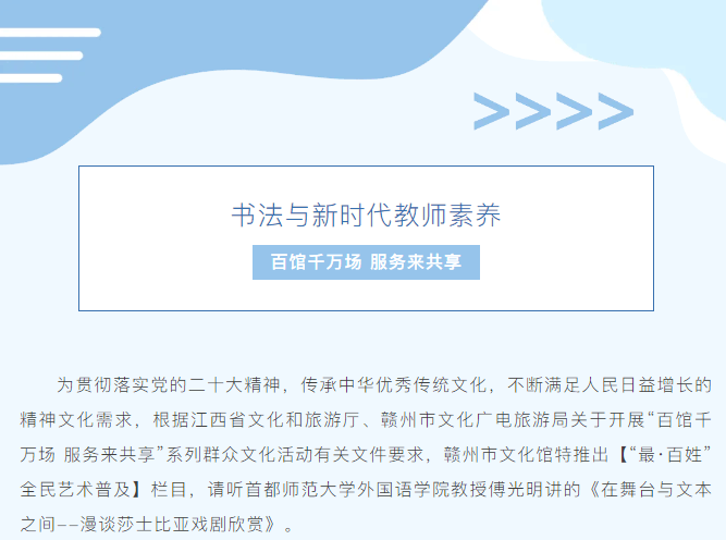 ※ 特别声明:本公众号仅用于赣州市文化馆公共文化服务及群众文化艺术普及,不用于任何商业用途。所转载文章及图片、视频、音频等版权均属原作者。如有侵权,请及时与本公众号联系。