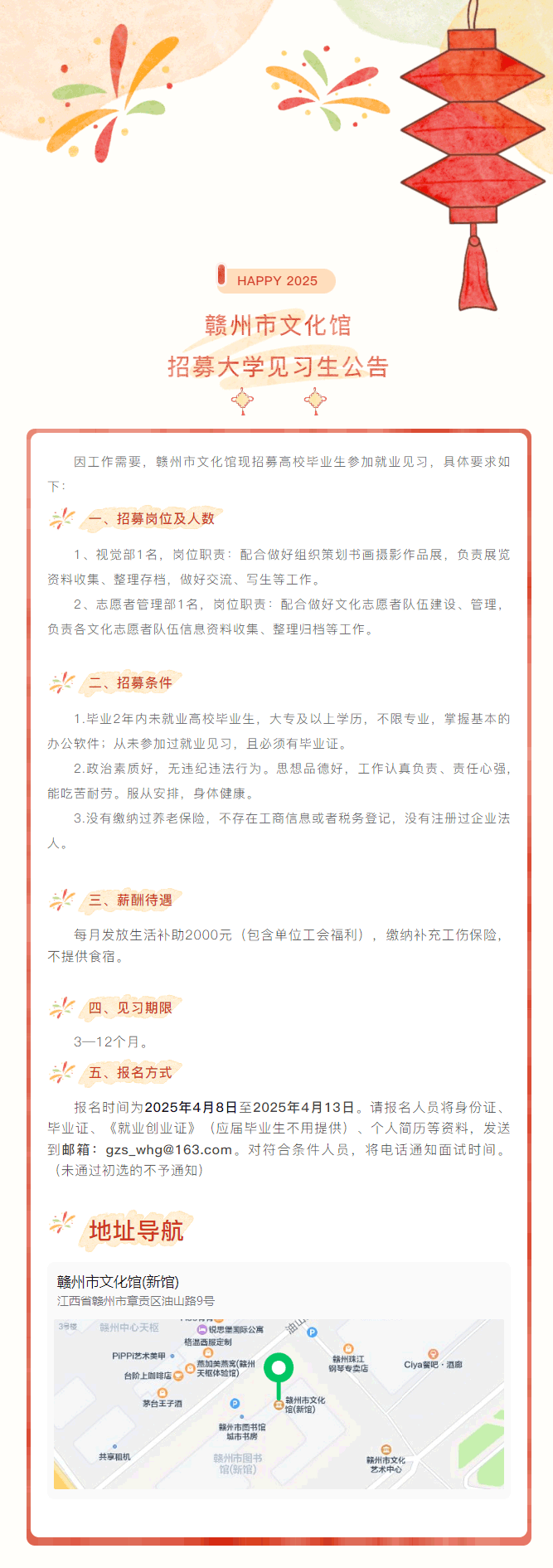 当前位置: 首页 > 文化动态 > 招募公告 | 赣州市文化馆招募大学见习生
