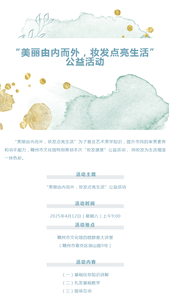 ※ 特别声明:本公众号仅用于赣州市文化馆公共文化服务及群众文化艺术普及,不用于任何商业用途。所转载文章及图片、视频、音频等版权均属原作者。如有侵权,请及时与本公众号联系。