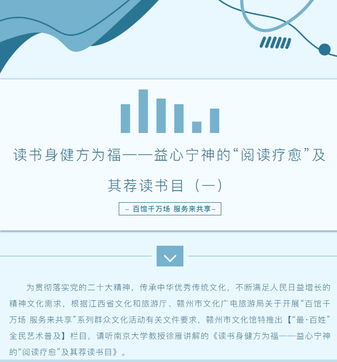 当前位置: 首页 > 文化动态 > 百馆千万场 服务来共享 | 读书身健方为福——益心宁神的“阅读疗愈”及其荐读书目(四)
