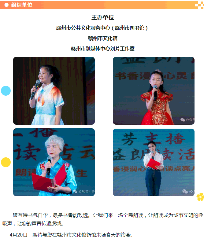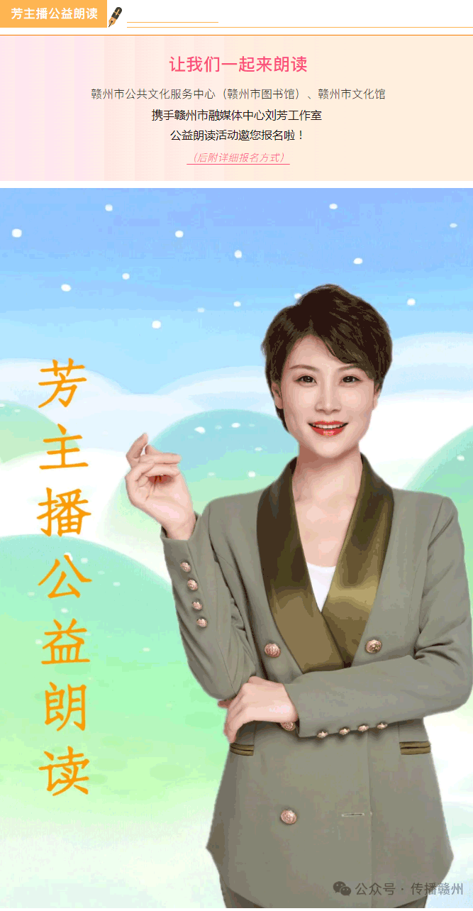 ※ 特别声明:本公众号仅用于赣州市文化馆公共文化服务及群众文化艺术普及,不用于任何商业用途。所转载文章及图片、视频、音频等版权均属原作者。如有侵权,请及时与本公众号联系。
