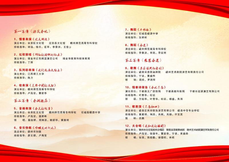 晚会在场面宏大、气势磅礴的大型舞蹈《欢庆解放》中拉开序幕,演员挥鲜花、舞旗帜、踩高跷、扭秧歌、打腰鼓、舞瑞狮,艺术地再现了红土地上军民共庆解放的情景。红歌联唱《鲜红的旗帜树起来》浑厚真情,唱出了新中国从这里走来,今日赣南续写绚烂,让人心潮激荡;歌舞《苏区振兴起宏图》、情景诗报告《春风不忘》,真挚激昂,述说赣南人民牢记领袖教诲、深学讲话精神,奋力打造新时代中国特色社会主义红色样板;音画演绎《春天的故事》、舞蹈《奋进》,生动地呈现了在改革开放和现代化建设的新时期,赣南儿女搭上时代列车奋勇前进,融入广阔世界。最后,全场观众起立,挥舞国旗,高唱《我和我的祖国》,唱出赣州干部群众,在市委、市政府的坚强领导下,上下一心共同建设家乡,共享幸福生活的心声,将演出推向高潮。在经久不息的掌声和乐曲声中,演出落下帷幕。