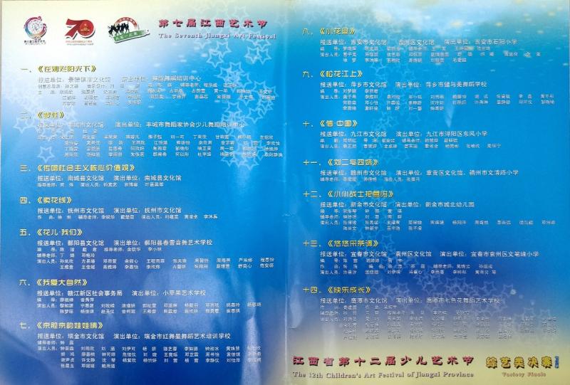 为贯彻落实省文化和旅游厅《关于印发<第七届江西艺术节·江西省第十二届少儿艺术节实施方案>的通知》精神,根据市委宣传部、市文广新旅局、市教育局《关于举办全市“礼赞中华”少儿艺术大赛的通知》要求,赣州市文化馆于今年6月份开展了全市“礼赞中华”少儿艺术大赛。截至7月中旬,各县(市、区)共报送了少儿舞台综艺类节目99个。赣州市文化馆于8月1日组织专家对作品进行了评选,共选了5件上报省群艺馆。通过省里复选,章贡区选送的《刘二与四妹》和瑞金市选送的《京腔京韵娃娃情》两个节目被选中,参加第七届江西艺术节·江西省第十二届少儿艺术节的决赛展演。