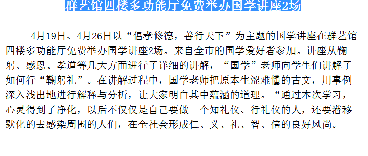 群艺馆四楼多功能厅免费举办国学讲座2场
