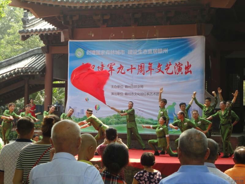 2017年7月28日红枫艺术团志愿者在赣州公园举行庆八一文艺演出。