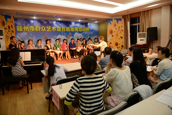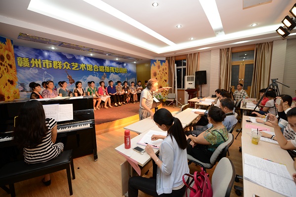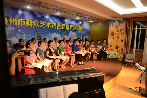 联系电话联系电话:0797-8275911为贯彻落实习总书记在文艺座谈会上讲话精神和我市文艺工作座谈会精神,有效搭建公共文化服务与繁荣群众文化的平台,活跃我市群众文化生活,提升基层群众合唱及指挥水平。赣州市群众艺术馆于2015年5月20日——21日在群众艺术馆多功能厅举办了合唱指挥培训班,此次培训班邀请了江西省合唱协会驻会副会长甘树椿教授为合唱指挥培训班授课,培训有17名来自各县(市、区)文化馆的文艺骨干,35名赣州市中心城区学校声乐教师;40名各艺术团推荐的文艺骨干,总计92人。